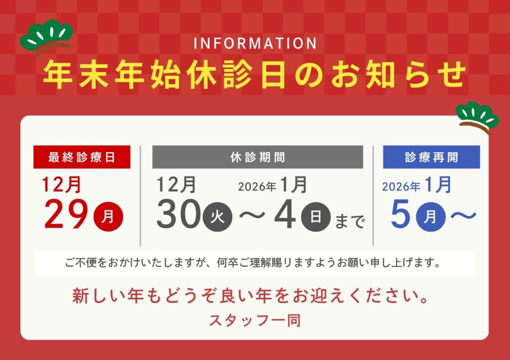当院の年末診療は12/29(月)18:30が最後となります。