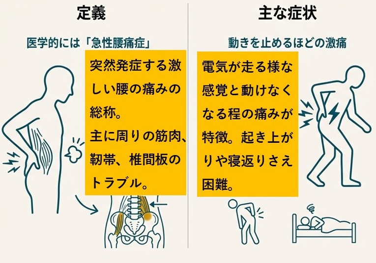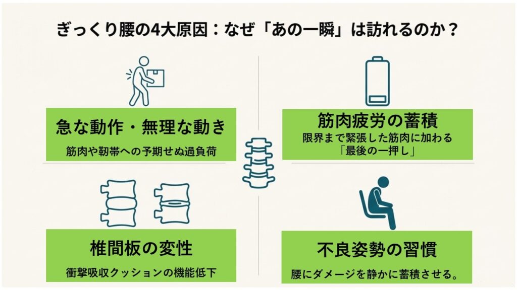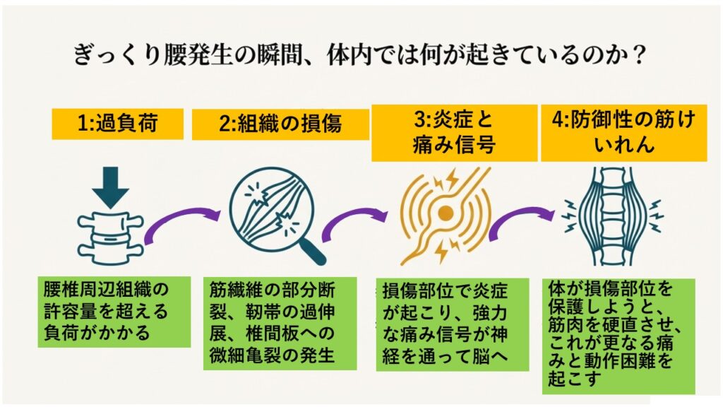 長時間労働やデスクワークで腰の筋肉が持続的に緊張すると、柔軟性が失われ硬直する。疲労が限界に達した筋肉は、些細な動作で筋繊維が断裂することがある。