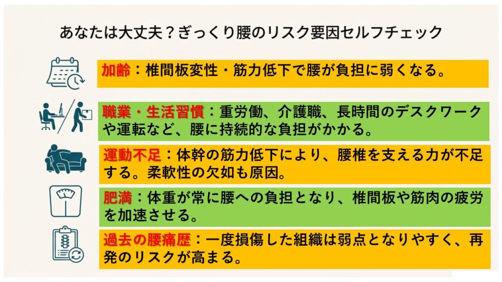 加齢、職業・生活習慣、運動不足、肥満、過去の腰痛歴