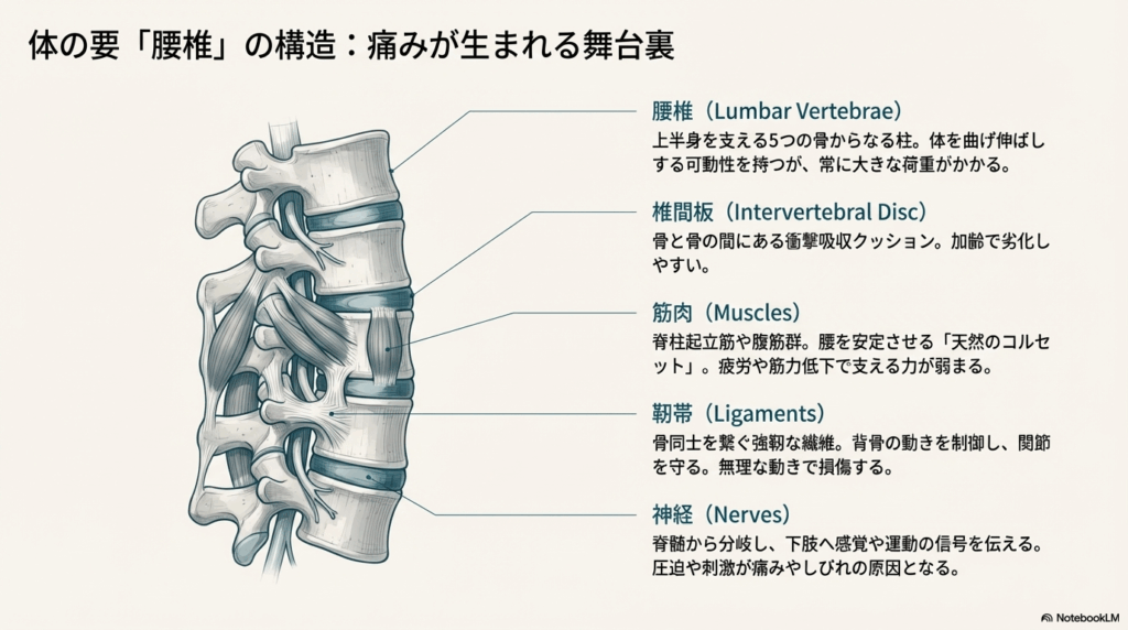 猫背や反り腰は、腰椎の一部に持続的なストレスをかける。これにより筋力のアンバランスが生じ、腰を支える力が弱まる。蓄積したダメージが、何気ない動作をきっかけに痛みとして現れる。