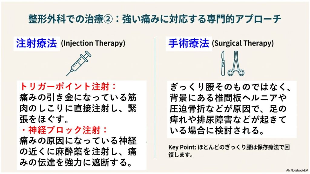 注射治療:薬物療法で改善しない、または動けないほどの激痛に対する即効性のある治療。